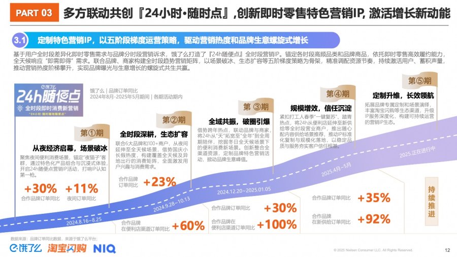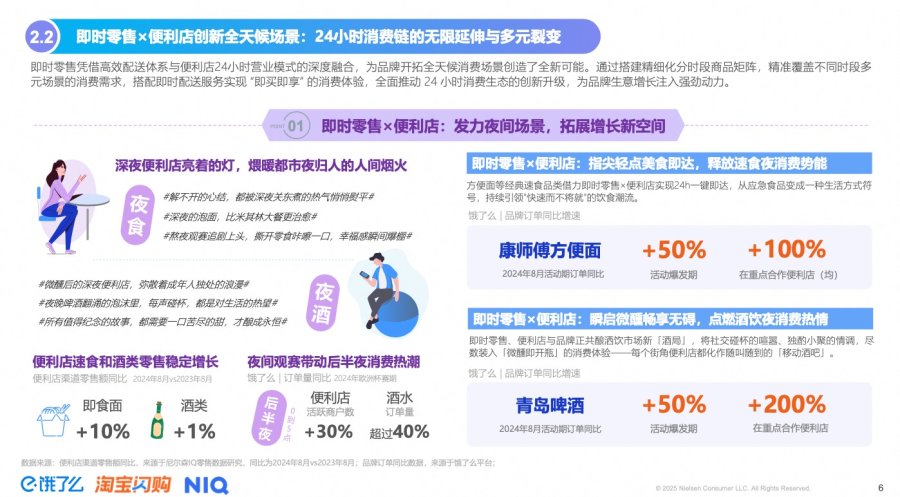 当以饿了么为代表的即时零售平台为快消品们打开24小时全时段的生意场景,品牌们如何真正抓住细分场景的需求和增长机遇?即时零售的旺季夏季已至,近日,饿了么和尼尔森IQ联合推出《2025即时零售全时段消费场景新趋势》。报告深度剖析近一年全时段消费新趋势、新场景、新需求,通过详实的数据洞察与鲜活的案例解读,为行业从业者提供策略参考,助力快消品企业在新赛道上持续领跑。