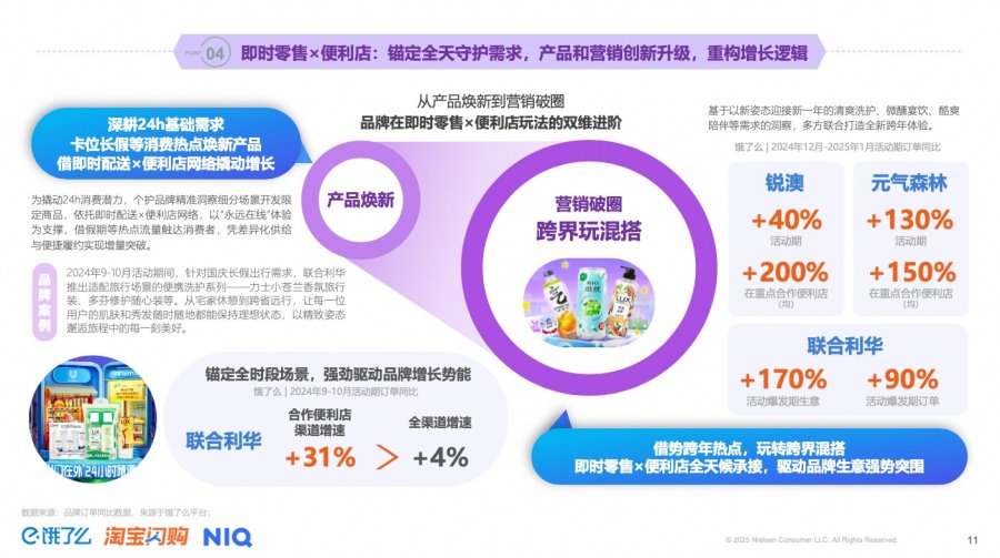 为撬动新场景消费潜力,个护品牌也开始基于即时零售渠道侧异地场景的需求开发限定商品。例如,联合利华推出便携洗护系列力士小苍兰香氛旅行装等,通过联合饿了么和便利店渠道精准触达消费者,凭借差异化供给与便捷履约实现增量突破,活动期间便利店渠道外卖量同比增长31%,显著领先全渠道增速(4%)。在平台撮合下,联合利华还联合元气森林等水饮品牌玩转跨界营销,收获客群和生意的新增长。