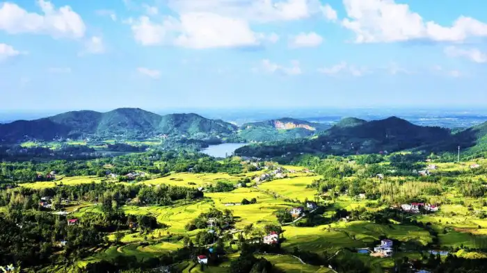 2025年7月1日,锁口梯田位于河南省固始县南部山区武庙集镇锁口村,夏日,站在黄土岭观景台放眼望去,坐落在群山环绕绿树成荫的锁口梯田,如摆放在山脚下一个巨大盆景。