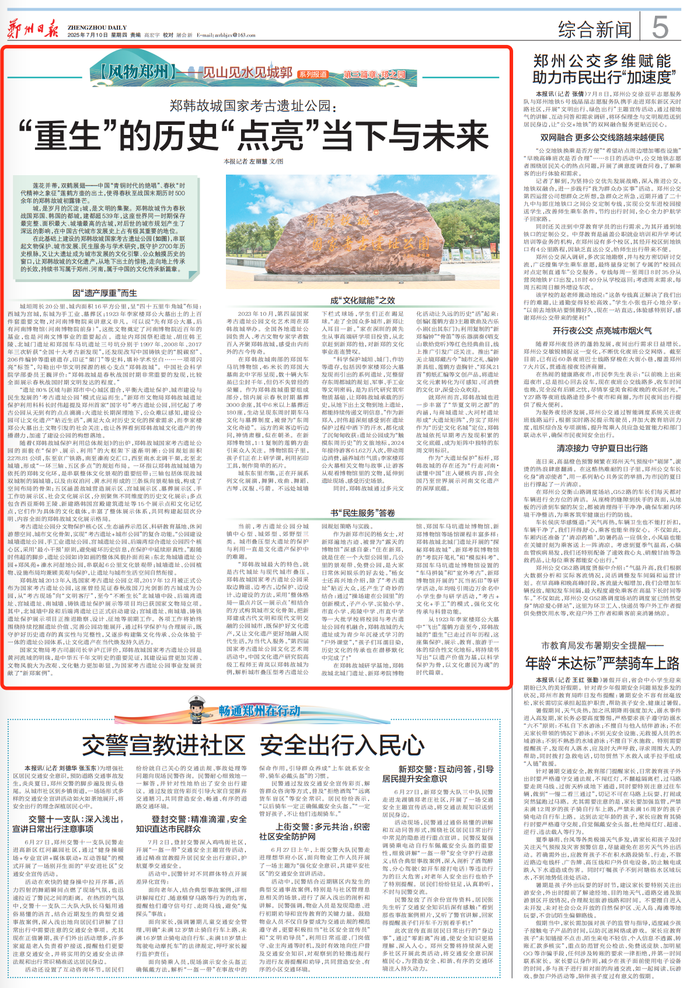 作为新郑市民的杨女士,对新郑遍地古迹、被誉为“露天的博物馆”深感自豪:“住在新郑,就是住在一个大型公园里,几公里的景观带、免费公园,是大家日常休闲娱乐的好去处。”杨女士还高兴地介绍,除了“考古遗址”贴近大众,还产生了奇妙的结合:通过“操场建在公园里”的创新模式,子产小学、实验小学、市直小学、苑陵中学、市直中学等一大批学校将校园与考古遗址公园有机融合,郑韩故城的大遗址成为青少年沉浸式学习的“户外课堂”,“孩子们耳濡目染,历史文化的传承也在潜移默化中完成了!”