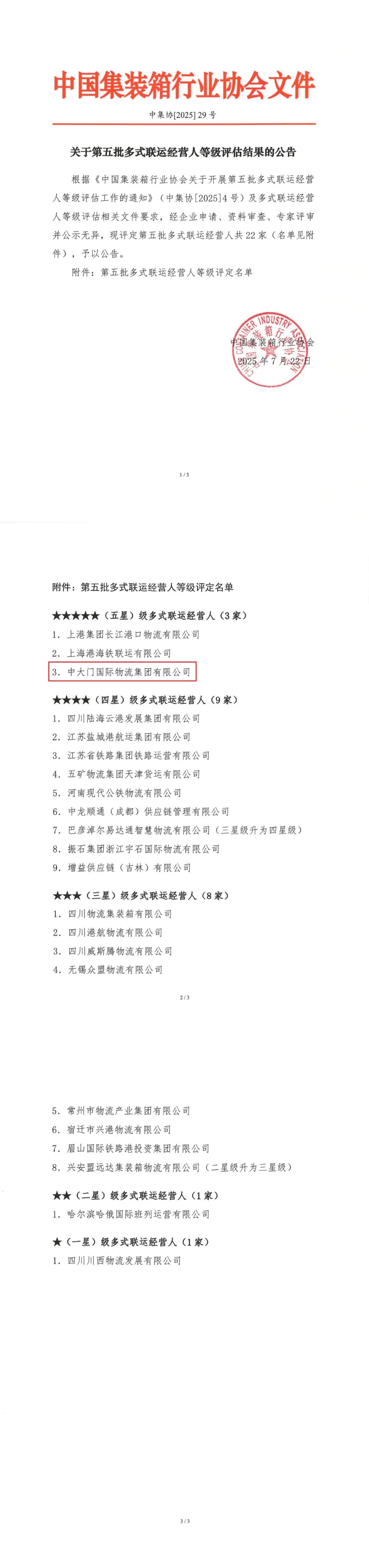 2025年7月22日,中国集装箱行业协会正式发布第五批多式联运经营人等级评估结果,经企业申报、资料审核、专家评审及公示程序,最终评定22家企业入选第五批多式联运经营人名单。其中,中大门国际物流集团获评最高等级的(五星)级多式联运经营人。本项目由中益研究院牵头申报。