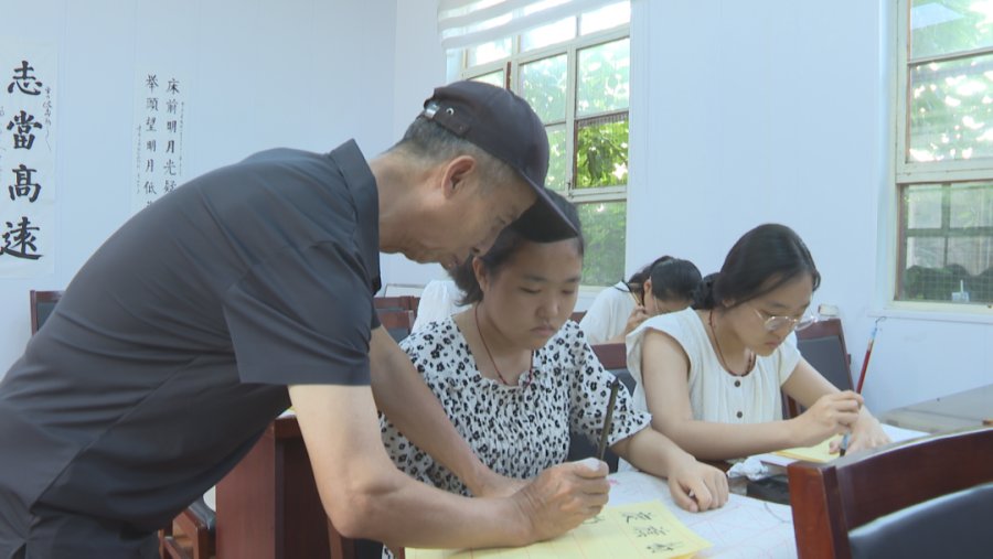 “咱们寺底村每年暑期办这个培训班,大家(年龄)高低,时间都不同,有些学过,以前就练过,有些就根本没有接触过毛笔,所以咱们就根据大家目前的水平,起步从楷书开始。”