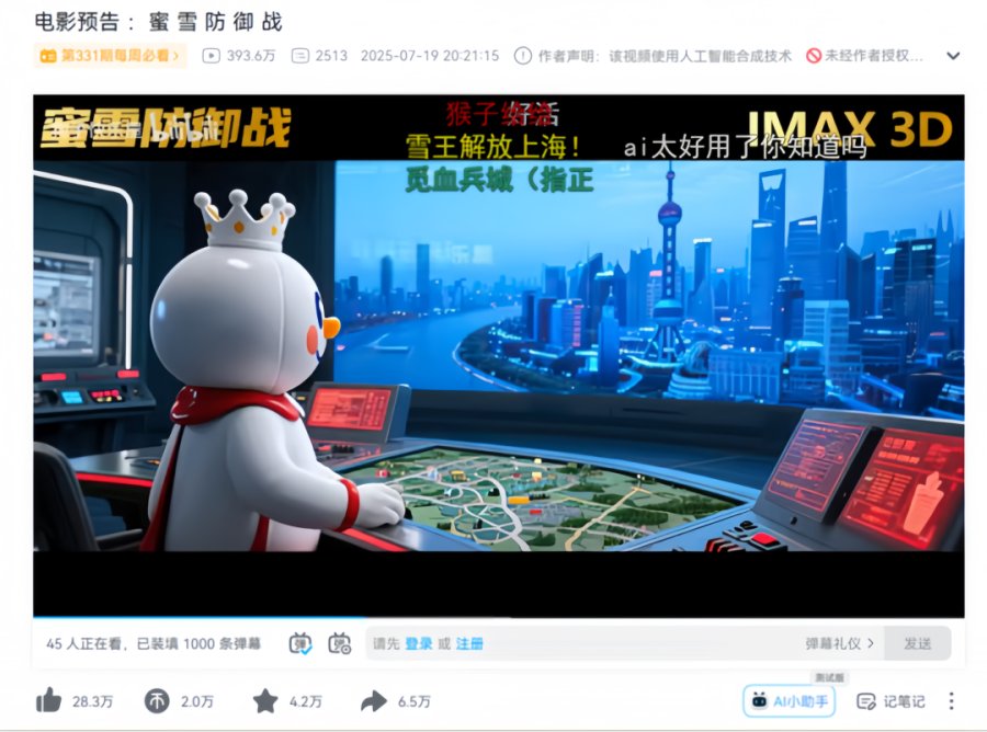 围绕这个设定,网友们展开了大量创作。B站UP主“狗子快乐屋”用AI制作的《电影预告:蜜雪防御战》,将东方明珠描绘成对抗蜜雪冰城吉祥物“雪王”的防御塔,视频播放量达到393万次;抖音用户则使用剪映模板拍摄自己“被攻击”的特效视频,“喝蜜雪真的会被东方明珠攻击吗”的话题更是吸引了近5000万人观看。