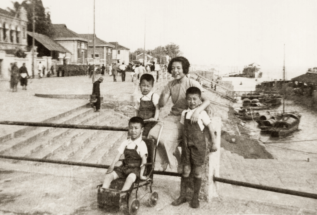 约1936年,于沙市江边,后排左起凌云、小姑母许毓瑛,前排倬云、翼云