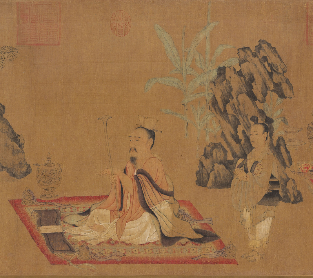 是卷所绘,高士四人,各据毡席而坐,衣冠制度悉依两晋六朝之制,非唐世流行之貌。有长髯披胸,广额沉思,垂袖正襟,似聆林外松风。其前童子执物而立,微躬如侍。有怀琴抱膝,侧首低眉,若闻音声自心间出,炉烟袅袅,香气与竹影交融。有高士披朱衣,襟带宽博,手执羽扇,面向幽林,神情旷远,似见山外之水流云散。有披紫裳者,倚几而坐,身姿稳重;童子侍后,执琴抱鼓,若候知音之唤。