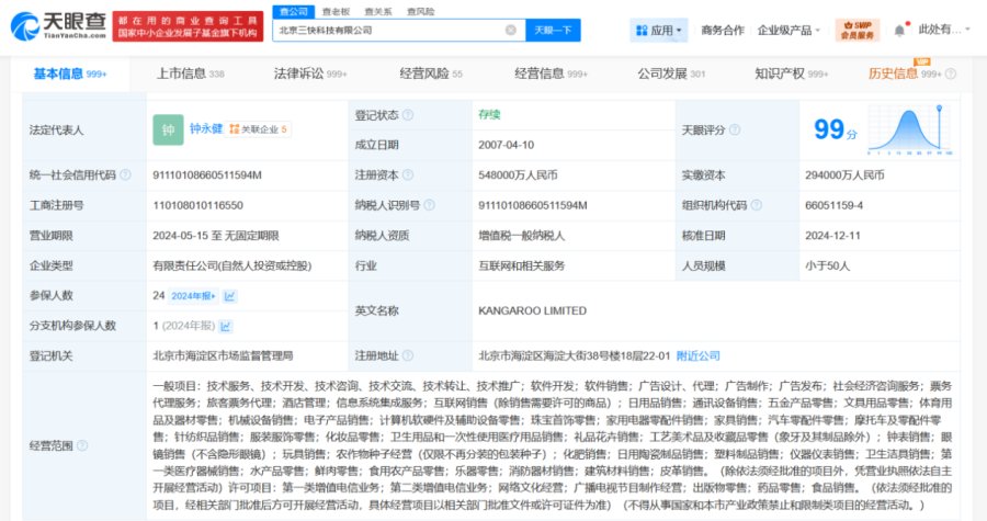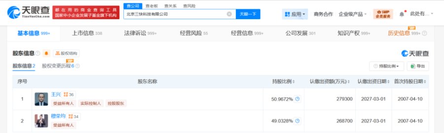 据悉,该公司成立于2007年4月,法定代表人为钟永健。而股东信息显示,该公司由王兴、穆荣均共同持股。