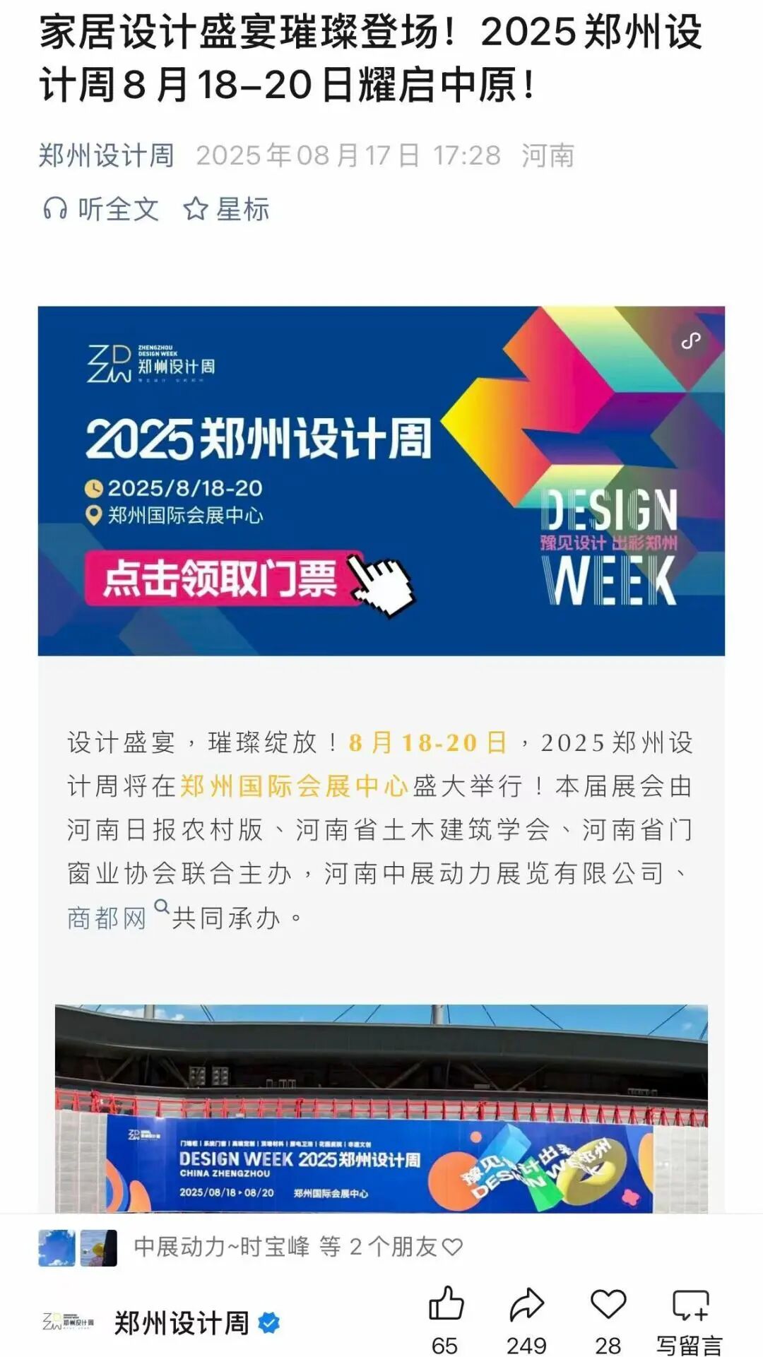 2025年8月18日,由河南日报农村版、河南省土木建筑学会、河南省门窗业协会主办,河南中展动力展览有限公司、商都网共同承办的2025郑州设计周,在郑州国际会展中心盛大开幕!