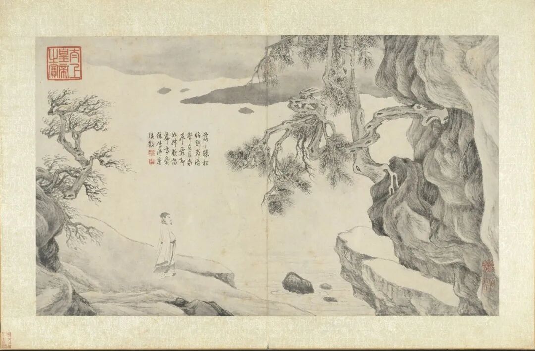 断岸如壁,层纹回环,右岩抱空,石理如绉。老松横出,枝干苍劲,节孔累累,针叶低垂,影覆潭面。左坡平展,沙砾微纹,水光淡莹,几点礁石静卧。修袍文士独立崖畔,手负身后,神思远举;眉宇含静,鞋底贴坡,衣褶随风。天际沉灰,云气浅合,岸线曲折,空处寥廓。画幅重心东偏,古木跨越两岸,气脉由此相接,远近顿成。