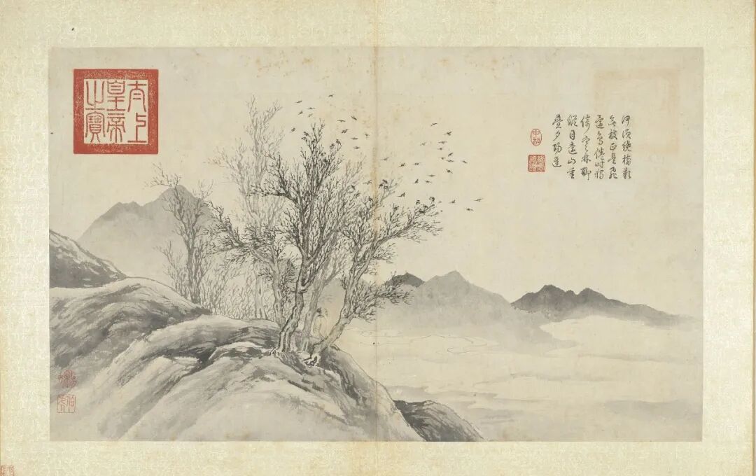 断岗起伏,阴崖抱云,坡背沉烟。丛树瘦硬,枝梢乱飞,根握沙脊。前川淡白,渚屿参差,水纹盘回。远岫连绵,墨气轻淡,天光空阔。群鸦旋舞,黑点散空,声意未至而寒意先生。树下修衫文士半隐,凭根侧立,目循雁道,衣褶微飏,履影贴坡。朱玺在上,光映灰白,整幅沉静,边角留清。