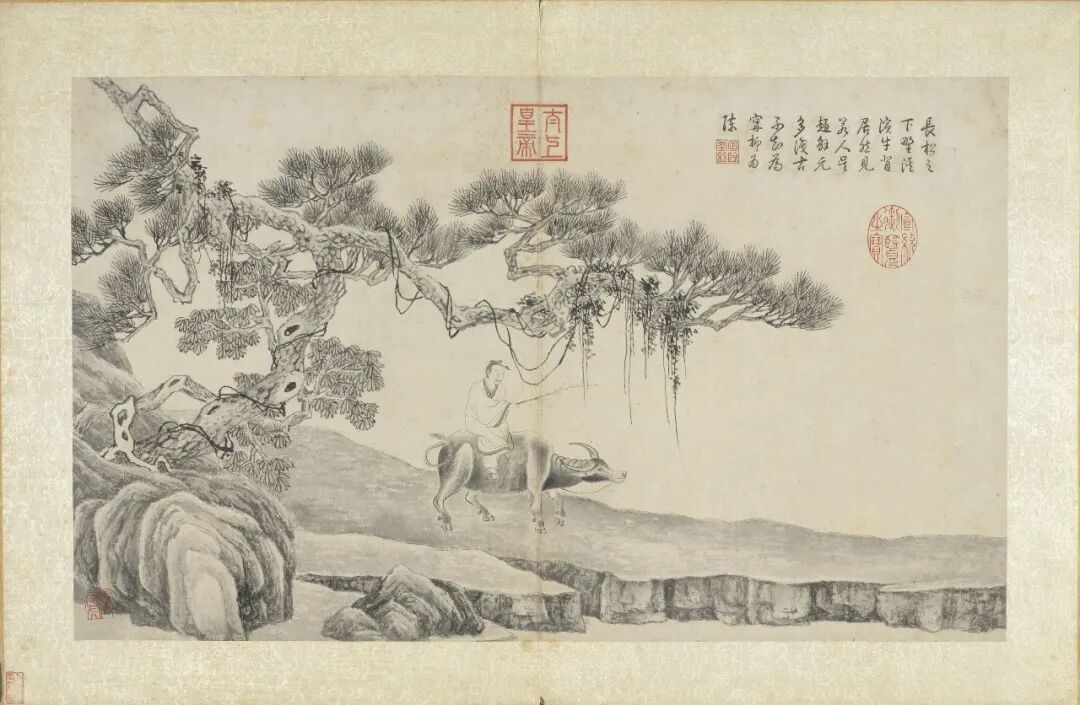 横松压天,虬干苍老,节瘤斑驳,垂萝如缨,针叶成云。峦背以淡墨铺开,坡脊回环,石岸断续。中景一童跨犊,衣襟轻起,手执短鞭,目送前路。牛角内卷,蹄迹将发,筋骨健劲。前坡平阔,崖缘横截,水痕微隐。构图上密下疏,左枯右清,气口开豁,风从松隙潜入,山光徐迎。松根探石,蟠伏如龙;涧口藏声,荒烟淡合。人物对古木,静势制动,画心沉着。