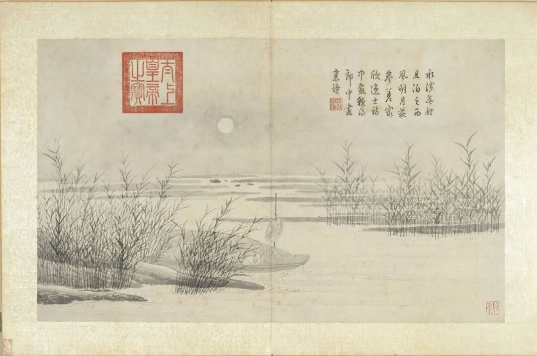 平湖寂然,芦荻成墙,锋叶交错,风迹未起。中流短艇,篷低覆身,孤樯系帚,圆月淡白,照入波纹。远洲横线,沙汀层叠,水天一色。左岸芦丛渐密,根脚没水,墨花点点;右畔疏列,空明开阔。渔人偃卧篷内,衣被不动,似守潮声。全幅静气若冰,秋意入骨,清寒漫纸,江南夜色深沉。大玺压天,红光照灰,画心顿生雄韵。浅沙隐现,横汀断续,蒲苇相依,露气浮白。遥天无云,冷色漫漫,水鸟不飞,渔火未起,静到可闻桂魄沉光。
