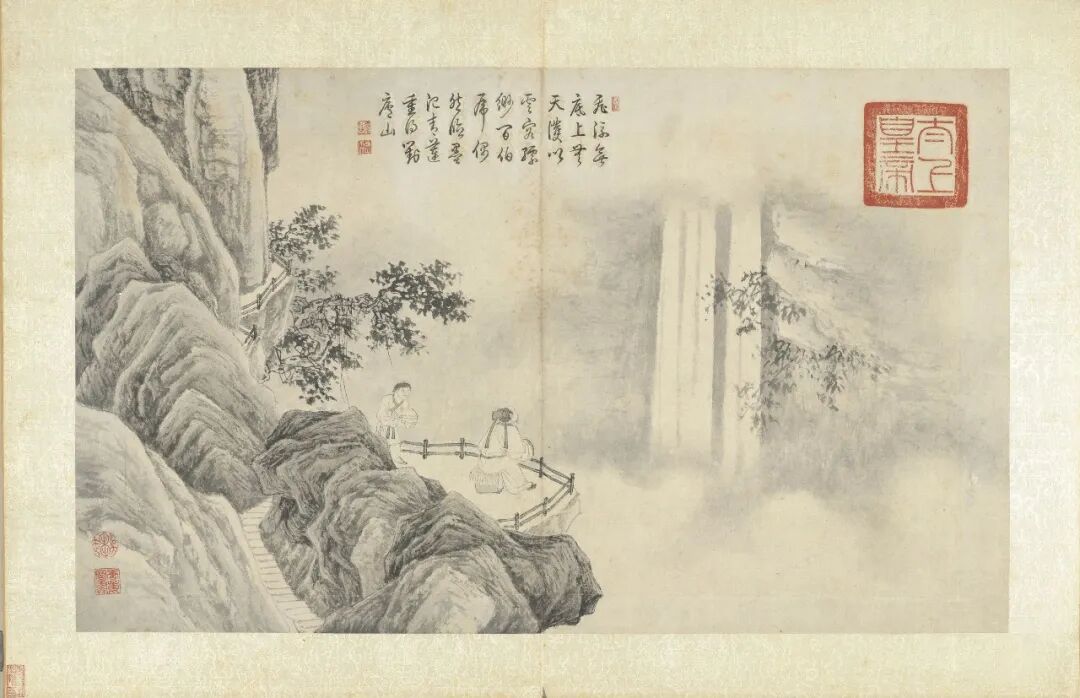 断崖当幅,层皴堆雪,石脉横参。栈道自山腰折下,栅栏围岸,苔痕暗湿。两人倚栏,一前一后,衣纹素雅,髻束从简。左林枝叶扶疏,风声藏谷;右面云海漫卷,白练三道,自天而落,喷珠溅玉,烟光扑面。台岸临虚,云脚捧瀑,深壑不见底。题署与玺印散置,上下相应,丹痕映灰,静处生响。