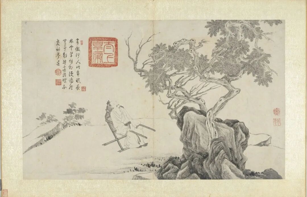 右幅危岩拔起,巨树盘根,枝干屈铁,叶密如云;瘿节纵横,老皮皴裂。岩前坡阔,草色微隐,水际平流,远岬微露;一人倚坐胡床,衣褶素净,仰面含笑,似听山风。树阴覆身,清凉入骨;空处云光清浅,天宇宽然。左野淡墨连山,枯柴两三,点作远林;下方崖麓旋折,碎石罗列,古意沉沉,静气满幅。题印朱明,声色不喧,衬作画眼。