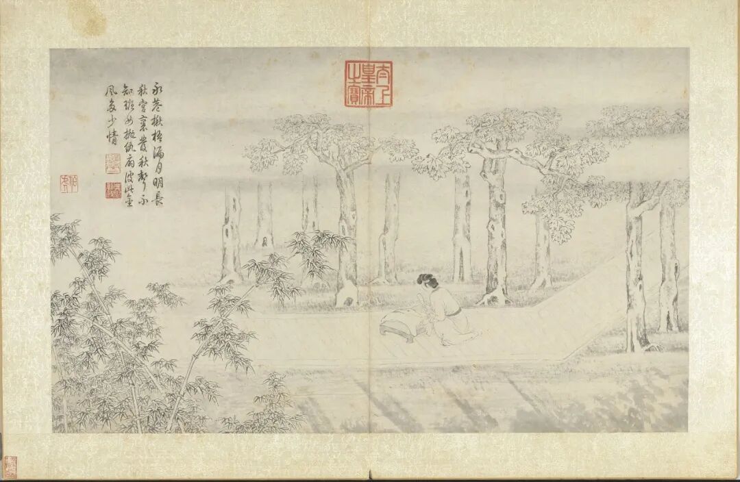 庭林清疏,乔木平列,身影高寒;前坡以板道斜引,篾栏低围,地气澄明。左畔修竹成屏,嫩节相依,叶脉细密;远处薄霭轻笼,水纹依稀。素裳仕女跪坐砧旁,手执玉杵,目注轻纱,鬟云贴颈,裙褶静垂。砧面润白,清波微漾;风过树稍,碎影上身。无声处似闻秋砧,迢递天涯;月痕未现,凉意先侵。