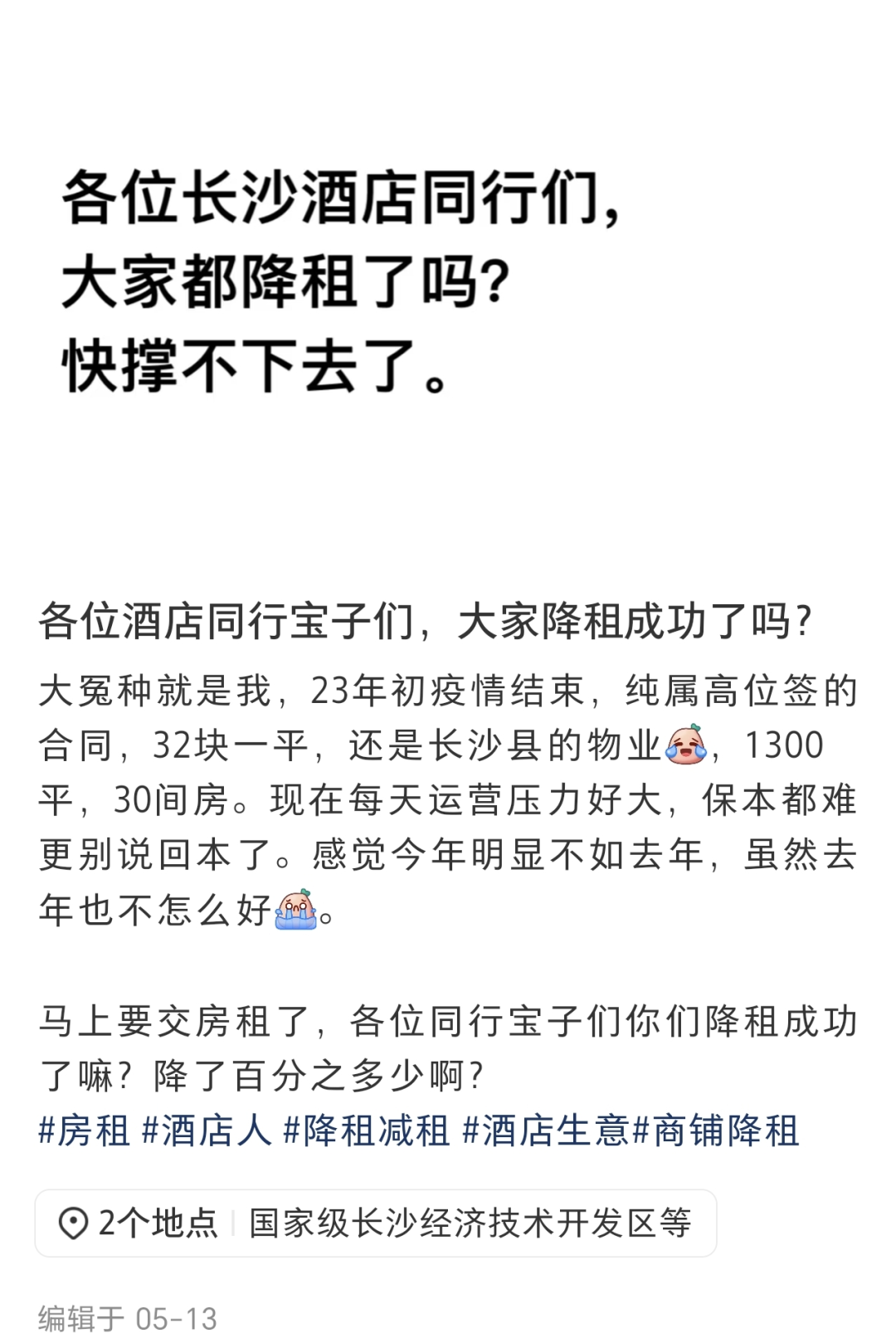 当然,许多房东也察觉到了这一问题,开始以降租的方式来挽回那些即将“出逃”的酒店投资人。