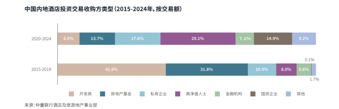 该报告披露的数据显示,在2015年至2019年,国资企业投资内地酒店交易额占比只有0.1%。到了2020年至2024年,这一数字已经提升到14.9%,是所有收购方类型中涨幅最大的经营主体。