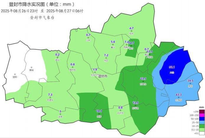 过程降水量:8月26日23时至27日05时,登封市出现阵雨、雷阵雨,局部暴雨。全市平均降水量12.7毫米,最大降水量出现在大冶56.1毫米(图1、表1),最大小时雨强34.8毫米(出现在大冶0-1时)。