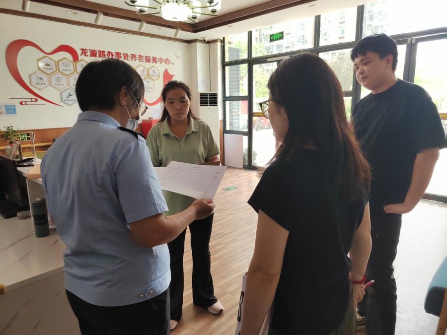 聚焦实效严监管,综合排查提质效。联合检查组围绕核心检查事项,采取“实地查看+资料核查+逐项排查”方式,全面覆盖养老机构登记备案、日常管理、突发事件应急预案等民政监管内容,以及食品经营许可、安全主体责任落实、从业人员健康管理、原材料采购台账、环境卫生、餐用具消毒、食品留样等市场监管要点。同时延伸检查从业人员配备、服务质量、管理制度落实、信誉星级评定等情况,实现“一次检查、全面体检”;针对发现的问题,检查组当场指出并记录建档,逐一明确整改意见和时限,推动形成 “问题发现—整改落实—复查销号”闭环管理。