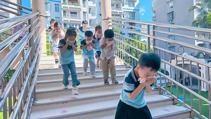 随着急促的消防警报声在园内响起,演练正式拉开帷幕。各班级教师迅速反应,立即停止一切活动,指挥孩子们用湿毛巾捂住口鼻,弯腰低姿,沿着预定的疏散路线,快速、有序地向安全地带撤离。整个过程中,孩子们冷静配合,老师们分工明确、保障有力,楼道疏导人员坚守岗位,确保了疏散过程忙而不乱。