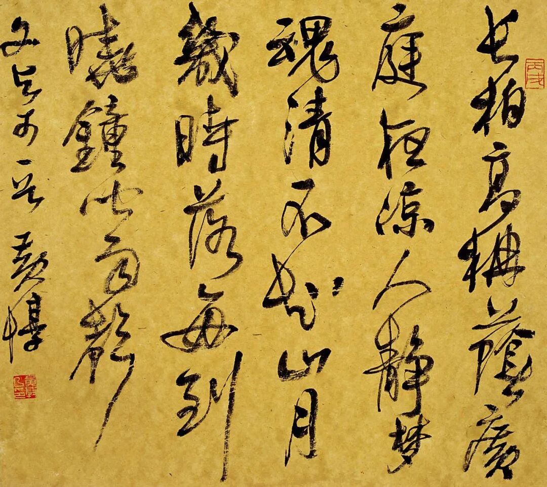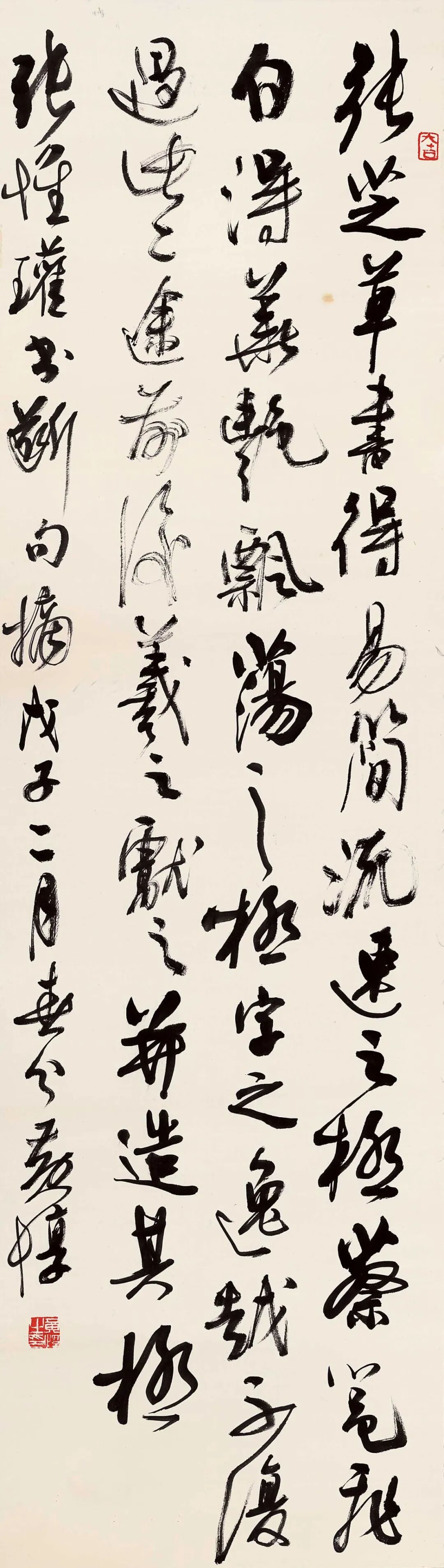 行草铺陈,疾徐有度。逆入以定锋,回收以藏力;提按更替,转折见腕功。横如长风,竖若劲松;点似流星,挑如飞羽。行间留隙,列内相望;大小参差,欹正互借。旁题细密,如丝织锦;巨印挺立,如钟在庭。观其一幅,先得气口,再审骨理;终见风神,清而不碎。