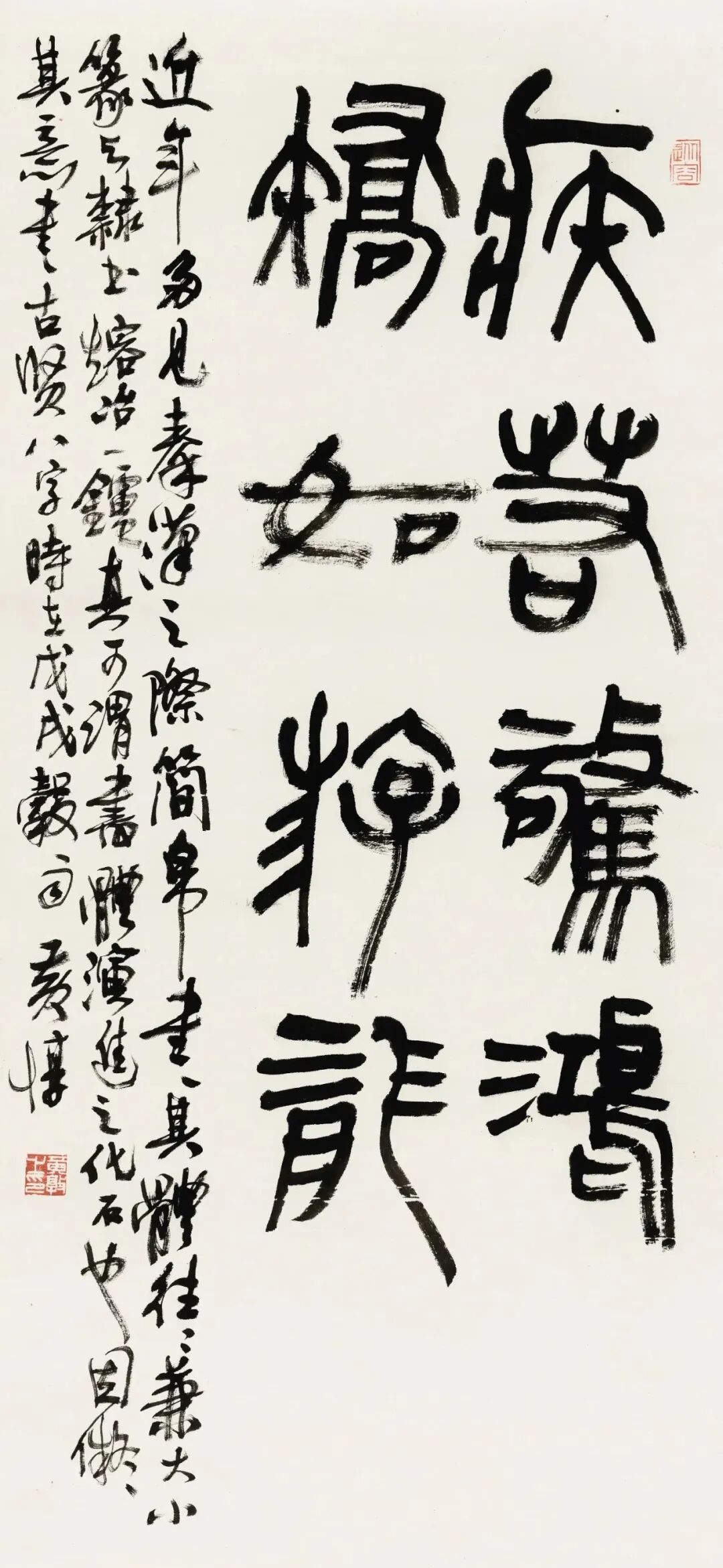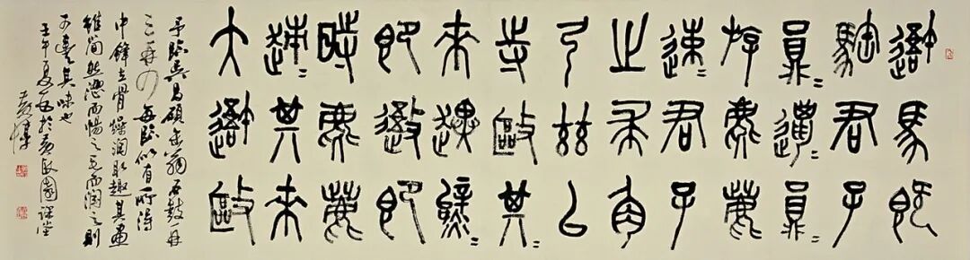 帖学为根,取其清腴;碑学入骨,取其雄强。两端对举,不偏不倚。或以圆转凝练,或以方折开张;或以枯涩见苍,或以润泽含光。书面之外,印面相随。刀口冲破,边痕如雪;朱白互生,静重相当。书印并陈,一如琴瑟,声各有色,终归和谐。