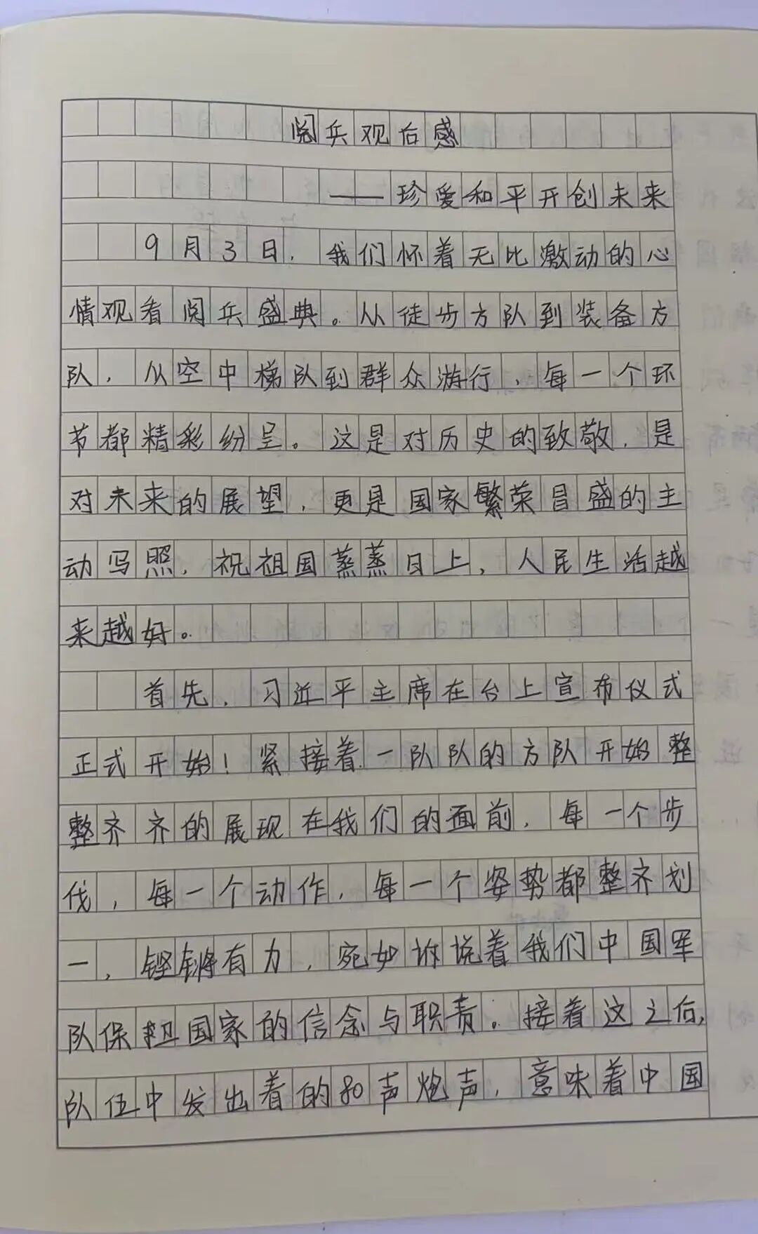 在观看阅兵之后,同学们心潮澎湃,主动分享自己的感悟。其中高二1班朱振宇、14班朱子贺、7班薛雨童以视频的形式分享个人感悟,高二9班罗雨欣、宋李子涵、张依浩则以文字表达他们真挚的情感。