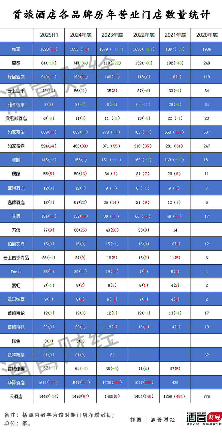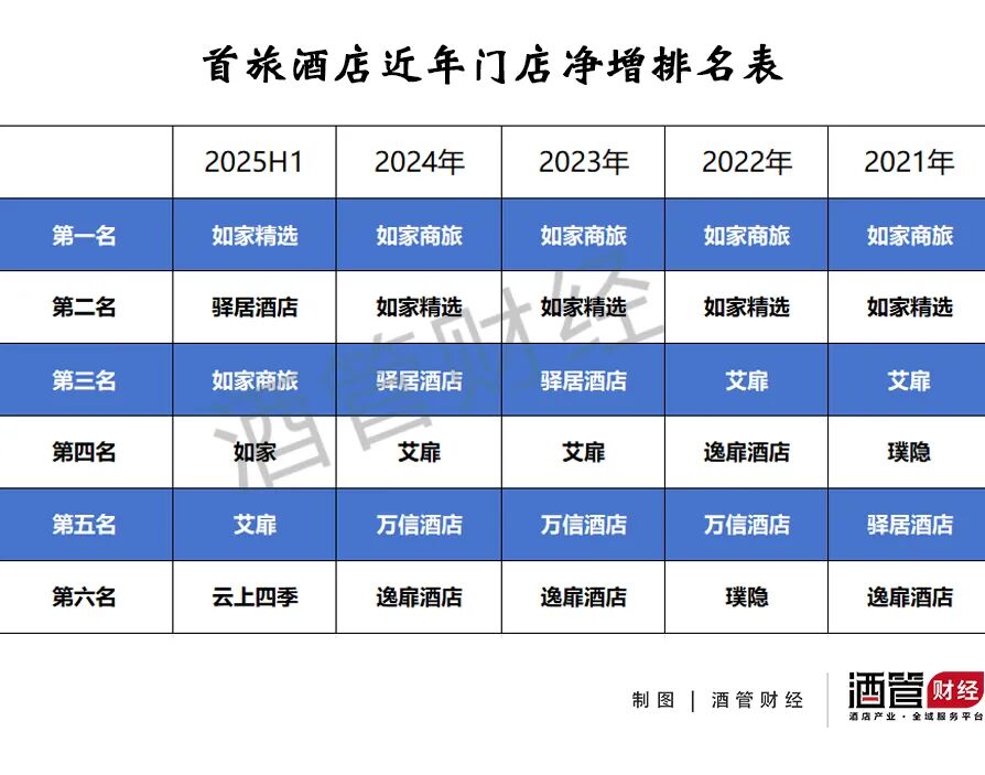 之于首旅酒店,2023年、2024年以及2025年上半年,如家精选、如家商旅、驿居酒店分别处于门店净增排行榜前三位置。