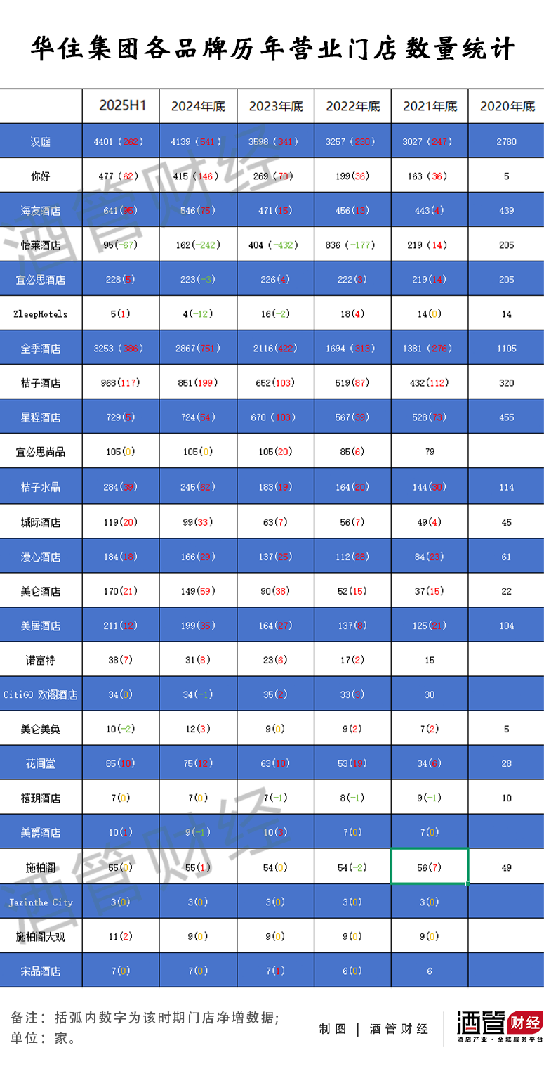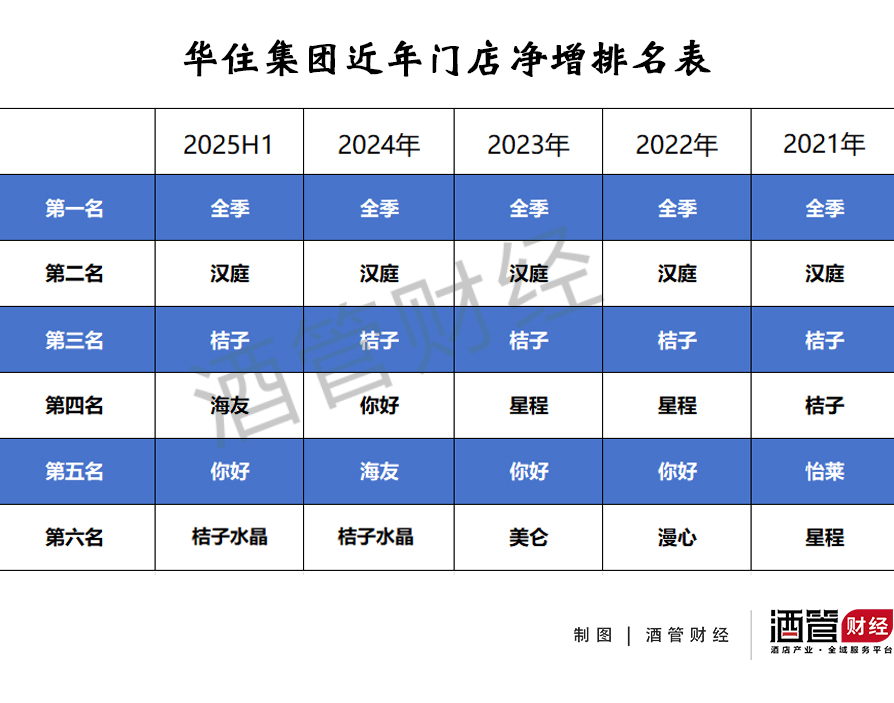 之于华住集团,从2022年至2024年以及2025年上半年,净增门店排名前三名非常稳定,分别为全季、汉庭、桔子。