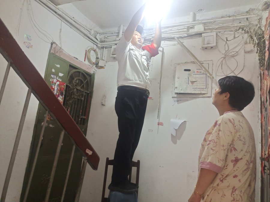 队员来到2号楼1楼楼道里,经过检查发现楼道的照明灯因使用太久已经烧坏,需要重新更换。一名队员随即跑到院门口的五金店买来一个灯泡,让另一名队员帮忙更换。看到楼道里的灯重新亮起,楼上居民纷纷向热心的巡防队员道谢。