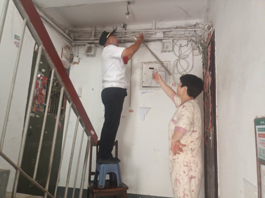 9月15日上午9时许,当郑州市金水区经八路街道巡防中队队员巡逻到经八路5号院时,一名女士上前求助,说他们楼道里的照明灯坏了,楼上住有老人,夜晚上下楼摸黑很不方便,由于家属院没有物业,不知道找谁解决,看看巡防队员能否帮忙看看是怎么回事。