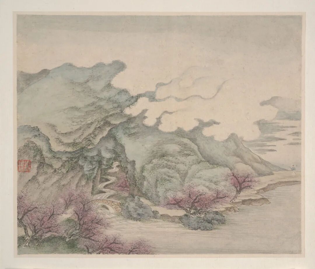 清代樊圻山水册页,铺展江南四时与山川性情。石畔幽居,怪石玲珑,茅舍依林;云岭桃汀,桥路回湾,桃英映水;柳汀湖亭,平湖空明,雁阵低横;山院小瀑,泉花溅玉,屋瓦生凉;江城云港,关楼临流,战舰列岸;松壑桥声,松干横斜,飞瀑跨涧;江岸晚林,篱落、行人、炊烟俱见,秋气澄澈;半壁晴岫,高岫并起,村舍安然。浅绛统色,青绿涵光;披麻、细皴、点苔、留白,虚实互映。构图或左密右旷,或前实后阔,笔气温润,格调雅正。山体以披麻合小斧,树法中锋破笔,水面横纹铺波,屋椽直线勒檐,路势引目贯气脉。八景互成组章,或写晴岚初启,或写烟雨将临;或纳桥亭人影,或存渔舟孤痕。画面清润,沉着,文脉长,观者入之,胸次渐宽,心神澄明。