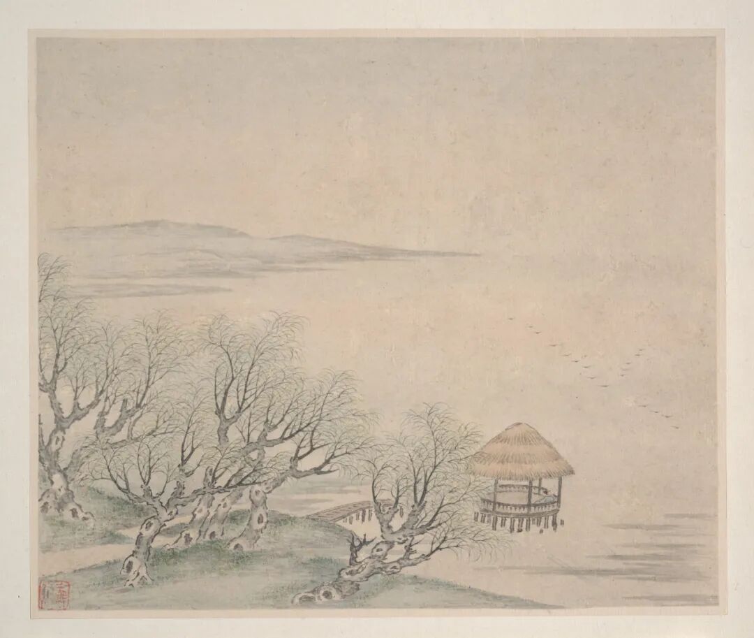 平湖广漠,空明无际;远岫如眉,云影淡浮。岸上老柳成行,苍皮多瘿,柔丝欲堕。水榭茅亭,半出波心,短栈斜通。沙痕细纹,波光微皱,雁阵低横。朝岚轻染,色调浅绛并翠,气象清旷,万籁无声,春意含蓄。