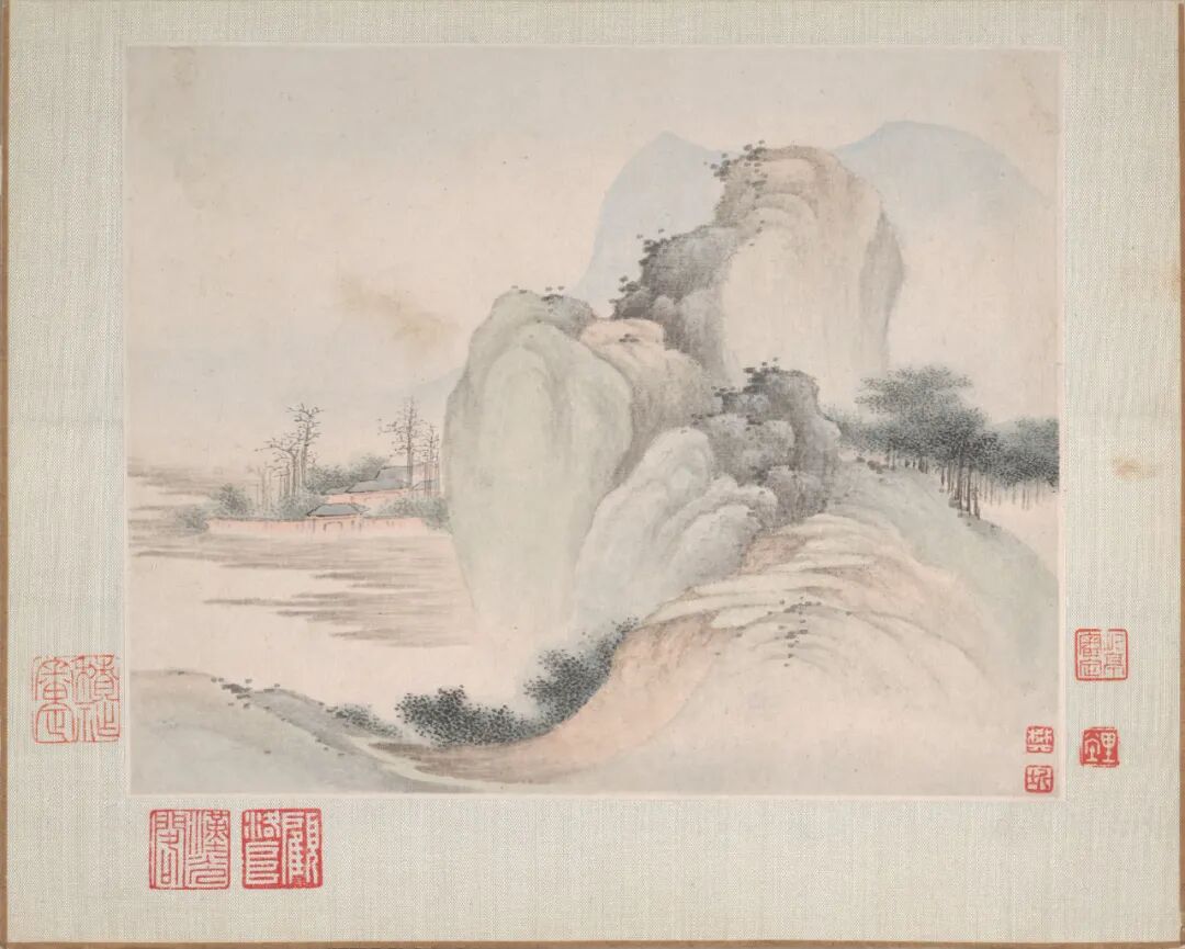 坐临图前,心气自平。山形不峭而稳,水面不哗而远;村舍不华而安,林木不繁而秀。烟霭吞吐,风从坡口轻来,袖底生凉。古意含蓄,格调端雅。可题半壁晴岫。回望层阿,云根欲动,江天寥廓,怀抱徐开,清韵久久。