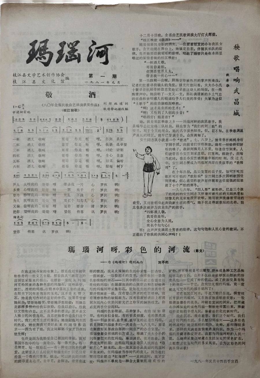 今忆《玛瑙河》,辄难忘更古之刊 ——一九八一年九月《玛瑙河》首期报纸。彼时尚非杂志,乃枝江县文学艺术创作协会会刊,仅正反两面,纸已泛黄,饱含岁月之情。报纸头版右上角印 “枝江县文学艺术创作协会、枝江县文化馆编”。
