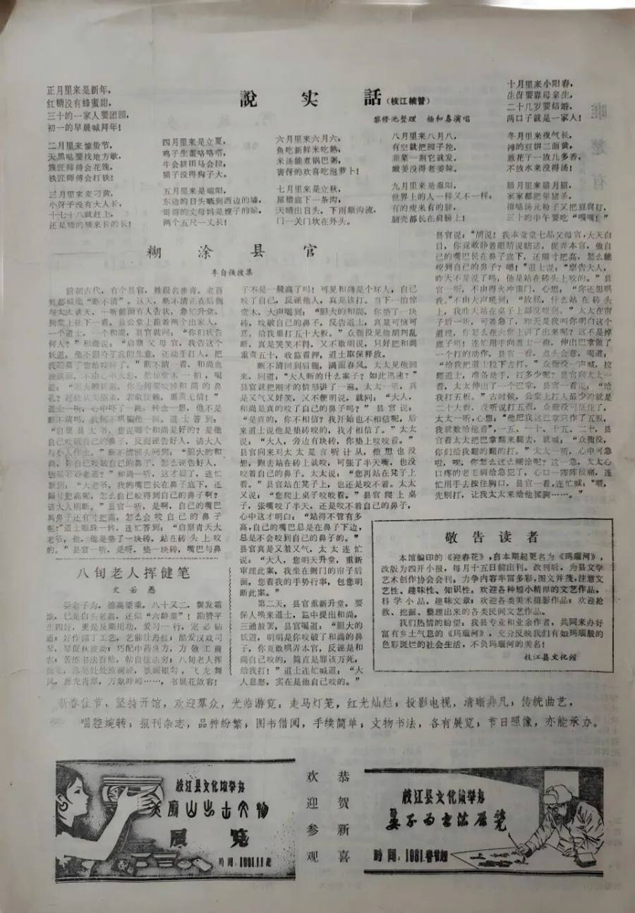 吾对此期报纸数篇文章记忆尤深。耿清华先生所著《秧歌唱响武昌城》,述吾瑶华公社农妇歌手尹安兰,于湖北省洪山礼堂唱民歌《敬酒》之事。文中写尹安兰着蓝布衫,系黑底花围裙,立台上镇定自若,伴民乐旋律开唱,清亮之音遍礼堂:“一杯酒儿敬,哥哥你是听。你全心全意为人民,莫长个勾勾心……” 台下掌声迭起,有省委宣传部领导特意上台与之一握,曰“此乃百姓爱听之曲”。每读此段,吾皆能想见尹安兰立聚光灯下之貌,其歌声满含乡土之朴与诚。