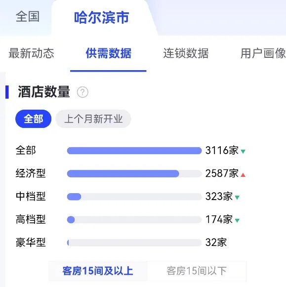 长期以来,哈尔滨经济型酒店仍占据绝对主导。全市5144家酒店中,4664家是经济型酒店,占比超过90%,这一方面源于当地居民消费力的客观限制,另一方面也与过往 “冬季依赖型” 的客流结构有关。