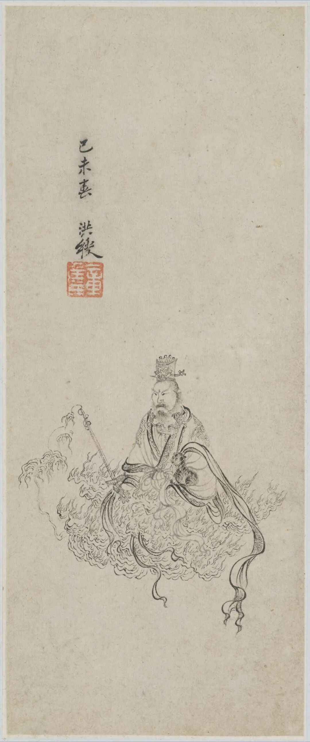 空幅高阔,云气低回;丹青停驻,神道潜行。冠冕峨然,佩印在怀,手擎玉杖,袍纹细密。陈公运毫轻劲,线法遒直,回锋生筋,疾涩分明。人物端坐火云,若雷部巡行,威棱不怒自彰。墨色淡浓相生,衣缘一抹花青,品格清冷,风骨孤高,境界肃穆而静。