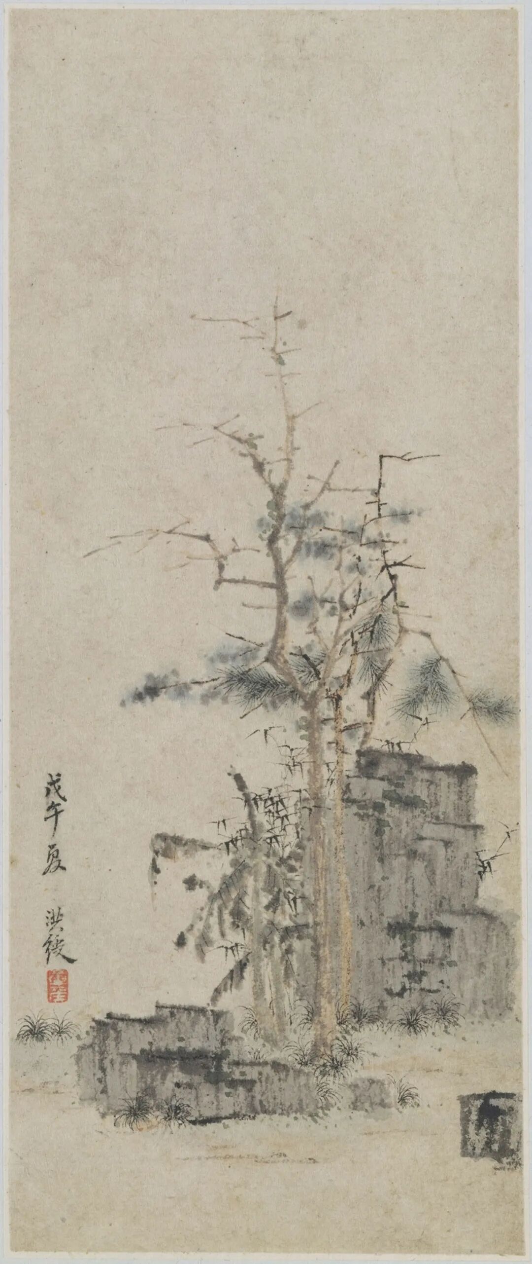 残墙压角,古松孤立,风骨瘦硬。陈公以微笔写松皮,点擦相生,墨气沉厚而不滞;枯枝穿空,针叶微张,寒声似在指下。石块叠置,皴法参以小斧与披麻,干湿互转,肌理明净。画面上部留天宇阔野,烟尘全敛,澄怀坐观,胸次顿清。