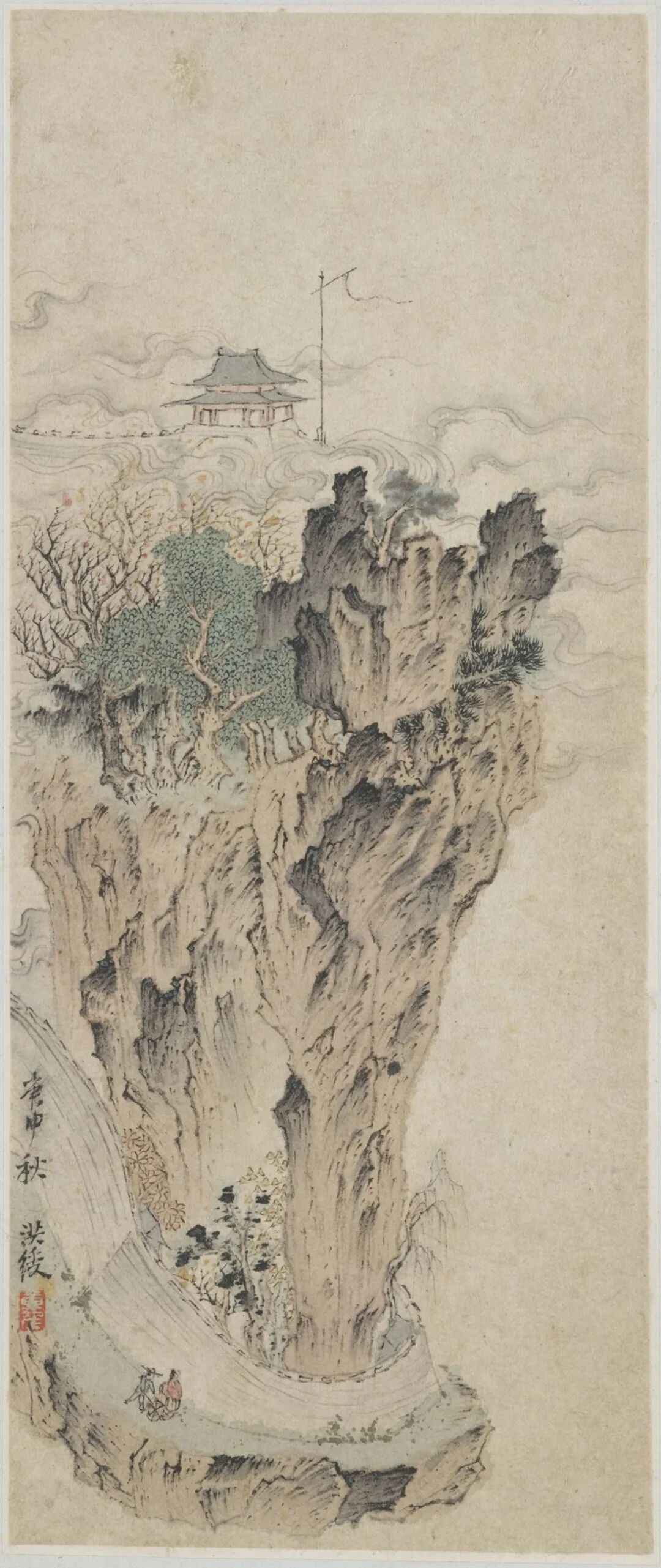 设色淡赭合石青,苍翠对绛,干湿交参;云头圈皴轻转,水墨堆层,留白成天。近景密而不塞,远岫淡而不虚,墙线一弧,引人入境;两行旅在坡脚,衣褶微动,脚下尘光,静中有行。笔性古拙,气脉清劲,尺幅见丘壑万里。