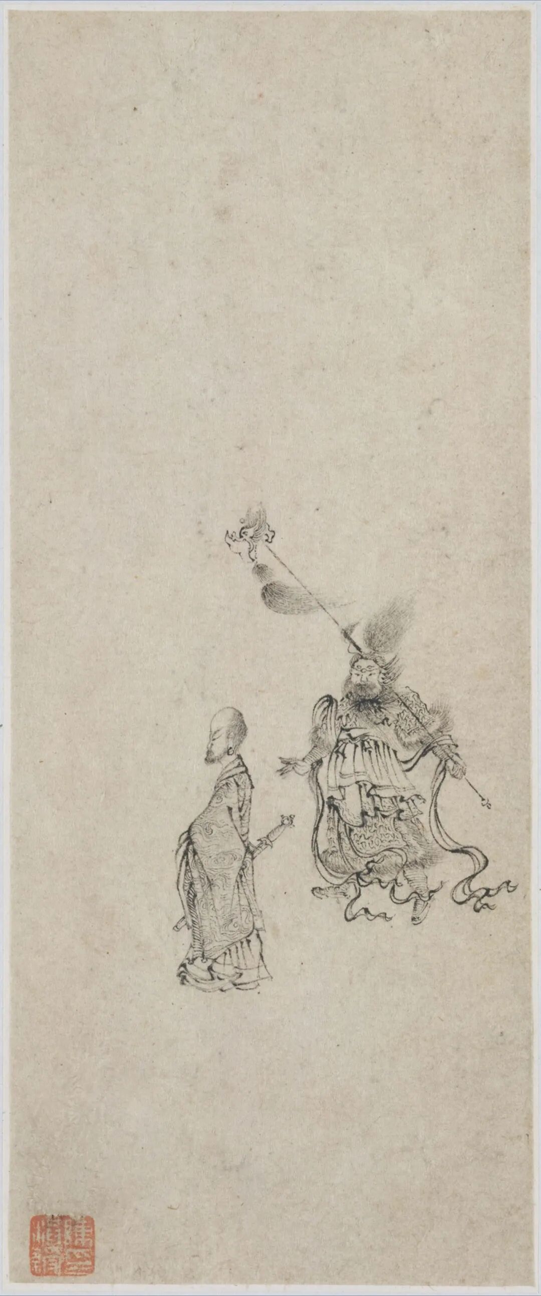 疏帧巨素,空阔如秋天。右下二人,一僧披裘,眉若古松,手执锡杖;一神披甲,髯卷风雷,袍带飞扬。线法纤劲,钩挑细密,止于寸许,而气象峥嵘。大留素面,云水无踪,孤景自生旷意,清寒入骨,静定入心。