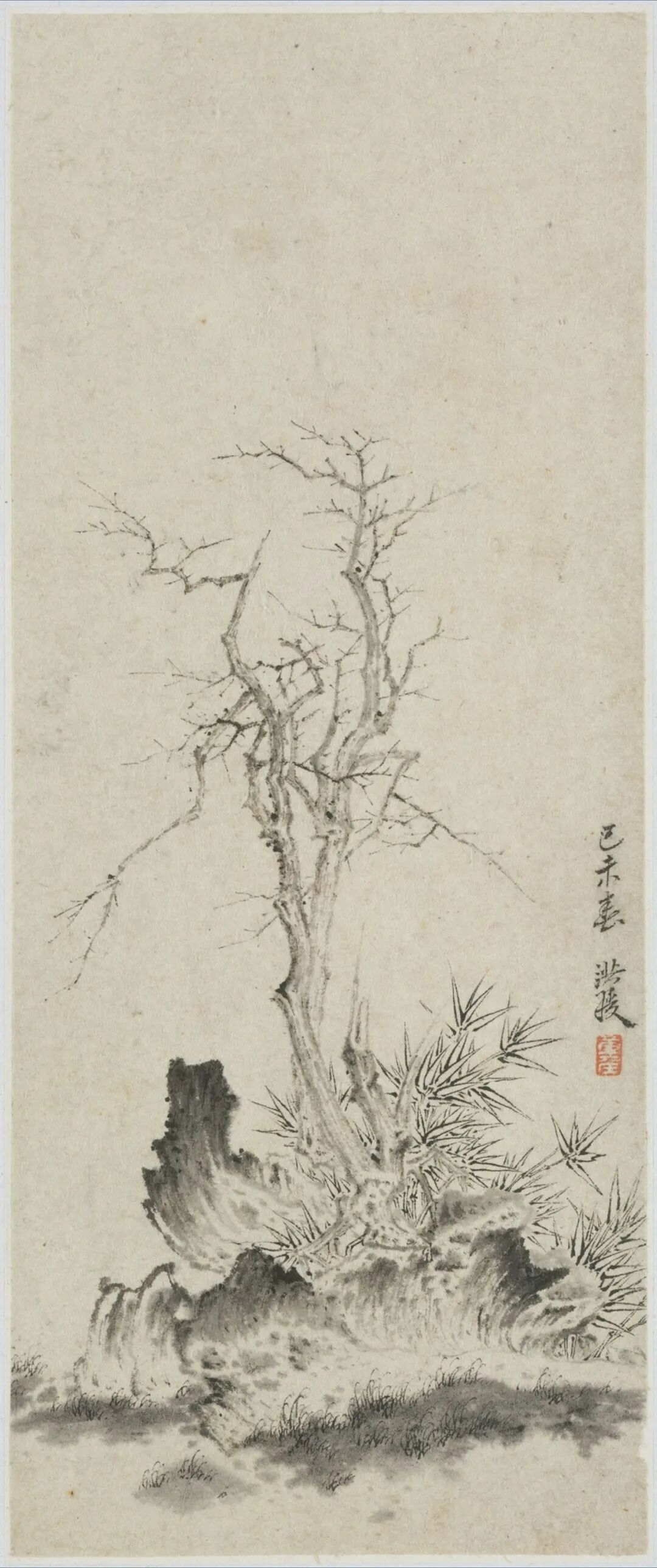 构图上扬,树根抱石,山体环抱;中景草坳,轻阴覆地;近旁数丛修篁,叶尖向背,风势潜行。线法以中锋为主,转折果断;点笔多蓄势,落处成珠;淡墨扫苔,干笔破土,层层叠见。枯干似琴,节理如弦,响韵无声;孤根如鼎,三足稳立,古意满堂。
