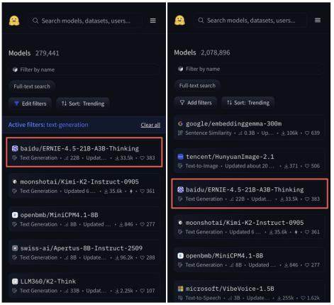 图:全球模型总趋势榜和文本模型趋势榜,百度均排名第一;资料来源:HuggingFace