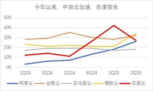 在这个有序阶段,对技术积累、工程能力、资金投入的要求大幅提升,具备全栈布局的大企业将占据主导地位,百度正是这一趋势的引领者和受益者。2025 年上半年,AI驱动百度智能云业务营收同比增长 34%,超出大盘10个点以上。