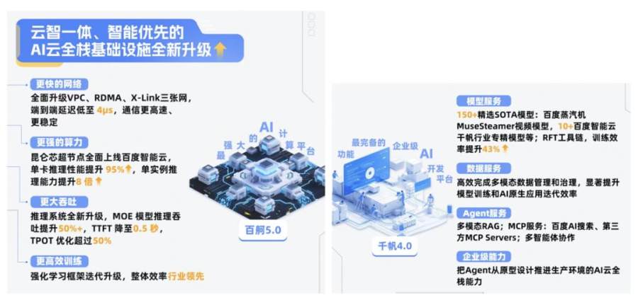 2)千帆 4.0(大模型平台):更新模型库,新增 RFT 工具链、多模态 RAG 能力、AI 搜索 MCP Server 及多智能体协作模式;企业使用的推理成本也大幅降低。