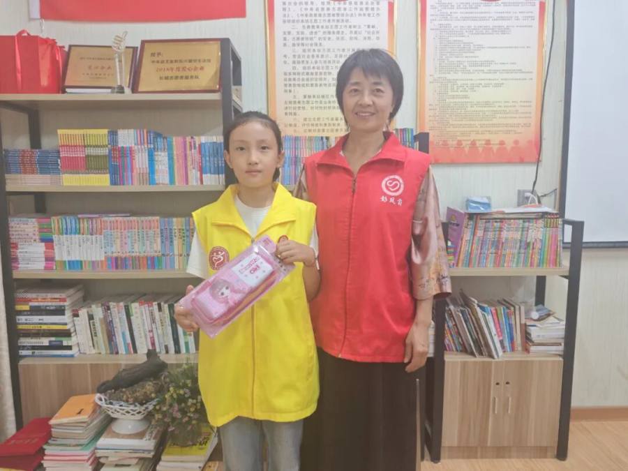 活动结束后,中牟县益奉社工“爱心妈妈”巾帼志愿服务队队长彭凤菊为“孝心少年”挑战活动八月冠军虎筱瑜发放奖品。