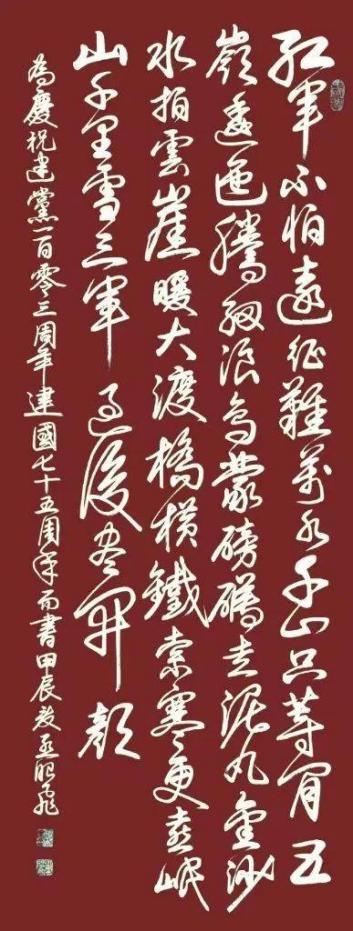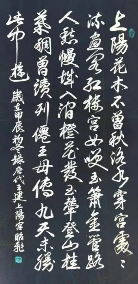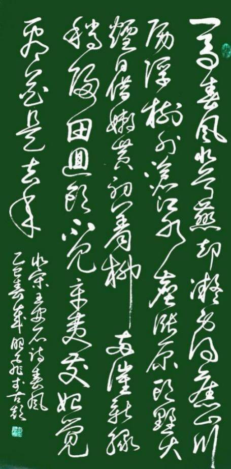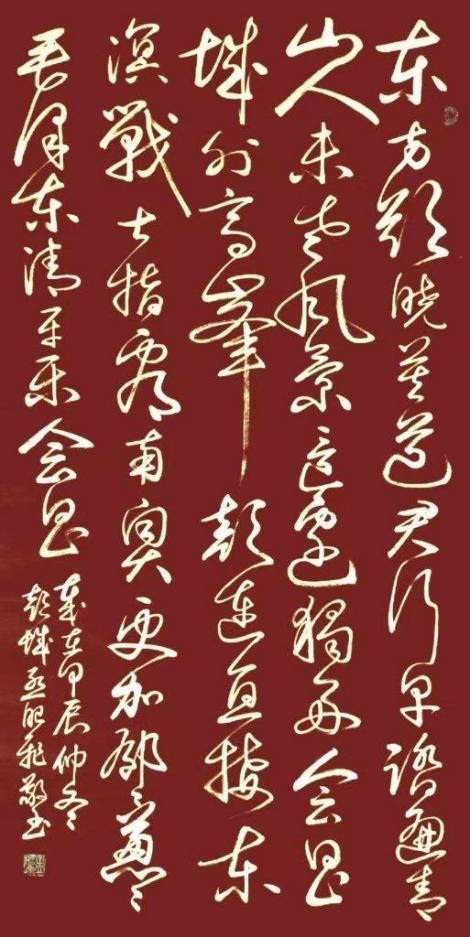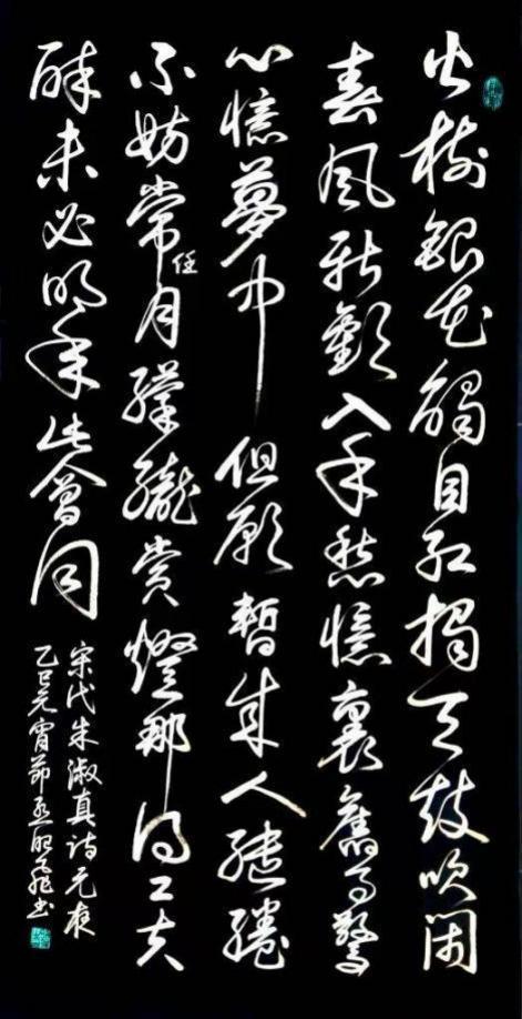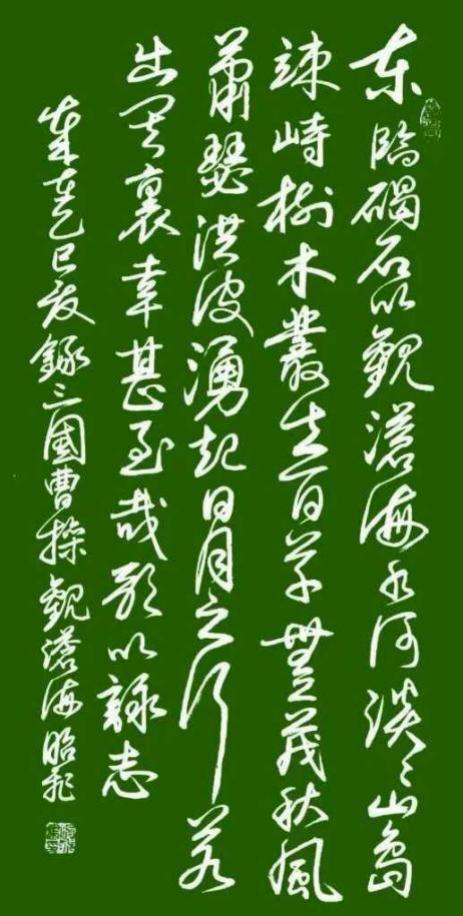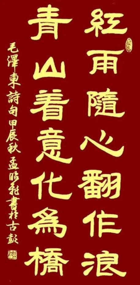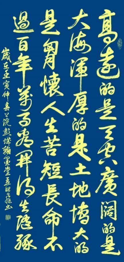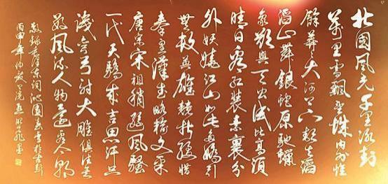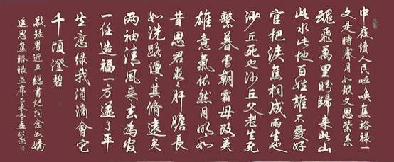 评价一幅作品,创作水平高不高、有无艺术价值,首先给人感觉的就是布局谋篇,即作品的章法。书写素材确定后,采用什么形式表现,是横是竖,是方是圆,是长是短,怎样安排作品的大小?不论是有要求还是没有限定尺寸,都要谋在书前,意在笔先、统筹考虑。多数书者都是先折纸叠好格再写,但是创作经验丰富的书家靠眼力和心算很快就能确定章法布局,一挥而就,且留白和款章恰到好处,这种能力靠的是日积月累,也是书法家的基本功之一。作品的布局谋篇,要把书写内容和表现形式统一起来,气势磅礴的诗词要写出大格局的气韵来;描写田园风光的诗词禀赋要写出意境美。书家要善于揣摩诗词作者当时的心境,尽量写的让作者和观者都比较满意。当然,作品的字写得大不代表气息大,作品尺幅小的照样可以写出行笔洒脱的大格局,关键就看书者如何把控了。余以为,书法家要有指挥家和导演家的胸怀和能力,把书写材料安排的恰如其分,得当入体,给观者以整体美和谐美的视觉感受。