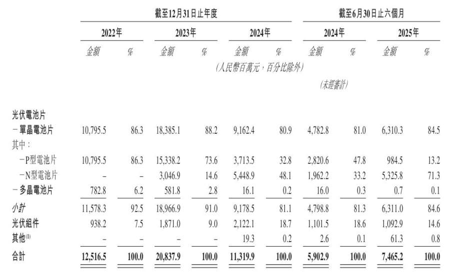 不过除了市场压力外,产品结构也是影响中润光能业绩的一大因素。2022年、2023年、2024年度和2025年上半年(即“报告期”),其光伏电池片收入分别为115.78亿元、189.67亿元、91.79亿元和63.11亿元,在总收入中占比超八成。