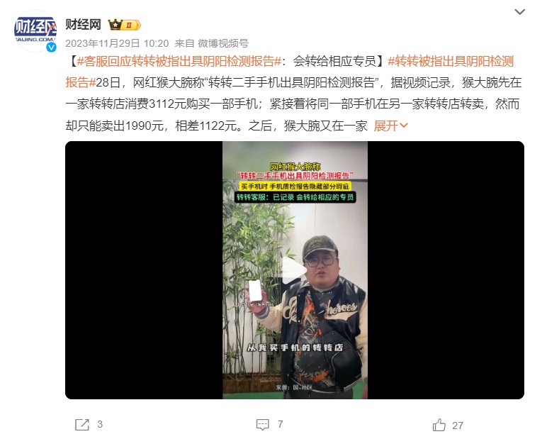 此外,正如黄炜所说,“自有市场”为网络诈骗、灰色交易提供了空间。2023年,一位博主“猴大腕”发布视频称,转转二手手机出具阴阳检测报告。同一部手机在间隔不到半小时内再通过转转回收时,转转出具的质检报告从显示没有问题到查出各种瑕疵,这一视频瞬间令转转陷入信任危机。