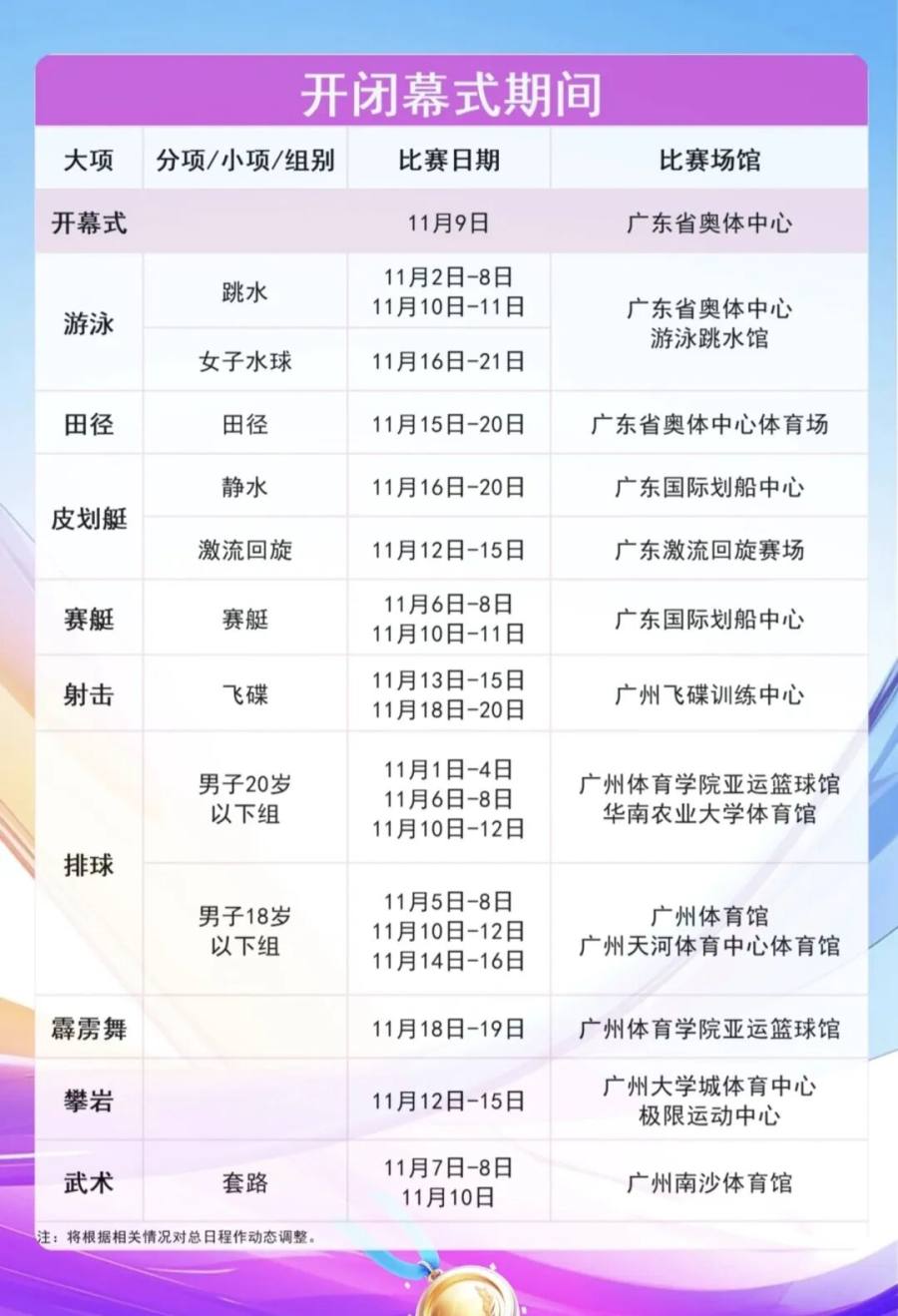 11月9日开幕式领衔,随后跳水、女子水球、田径三大比赛轮番登场。