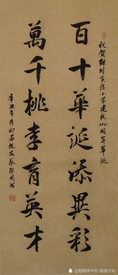 2019 年 10 月 书法作品入编《联墨 艺术 进校园》,为了进一步推进“联墨艺术进校园活动”,丰富校园文化生活,提高学生艺术修养,中国楹联学会书法艺术研究会特开展《联墨艺术进校园——传承经典中国当代名家作品集》,甄选出一批具有代表性的中国当代联墨名家,针对其艺术造诣进行一次创新性、全方面、系统性的编纂整理及宣传推广展示。